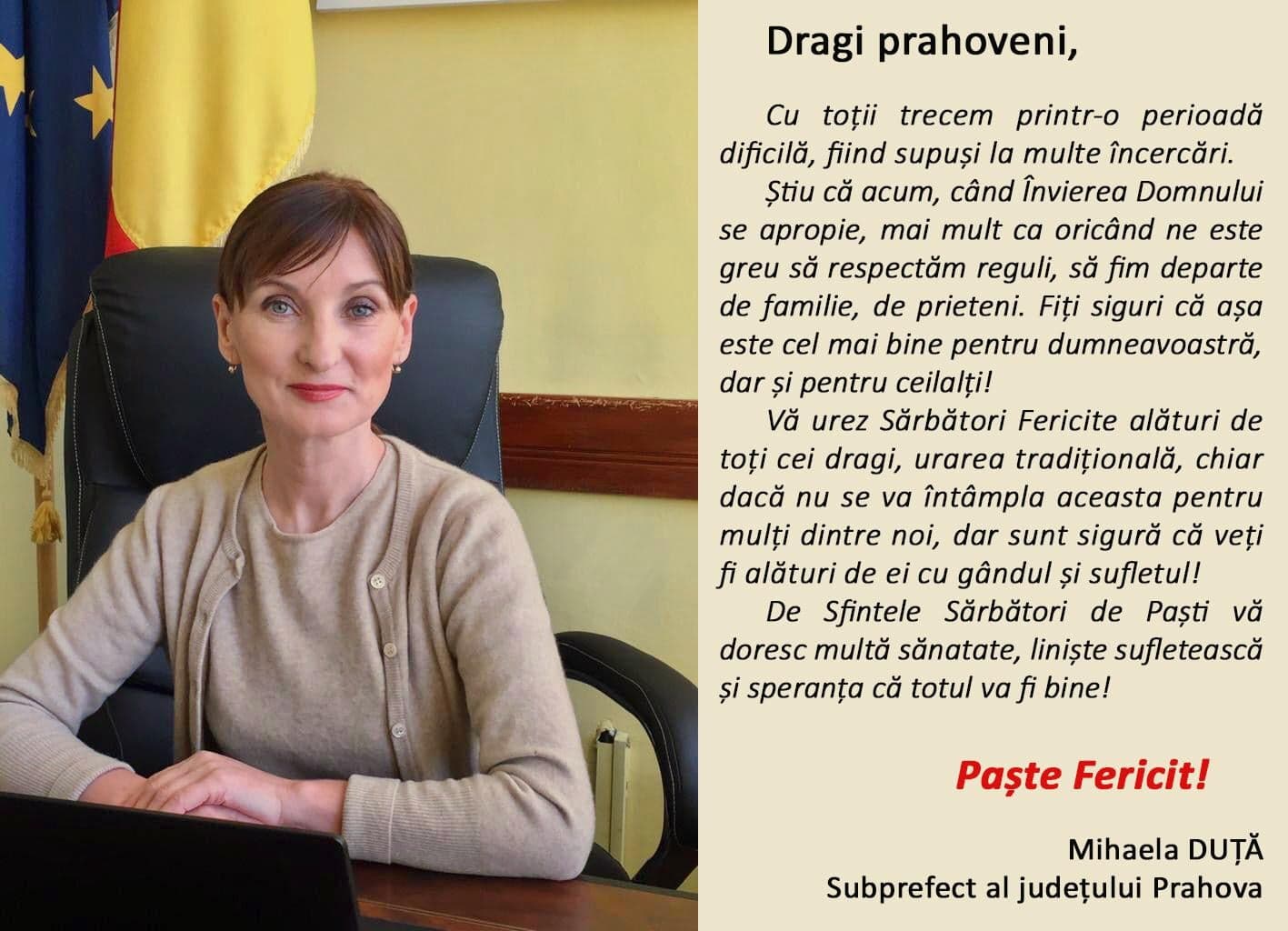 De Sfintele Sarbatori de Pasti va doresc multa sanatate, liniste sufleteasca si speranta ca totul va fi bine! – Mihaela Duta – Subprefect al judetului Prahova