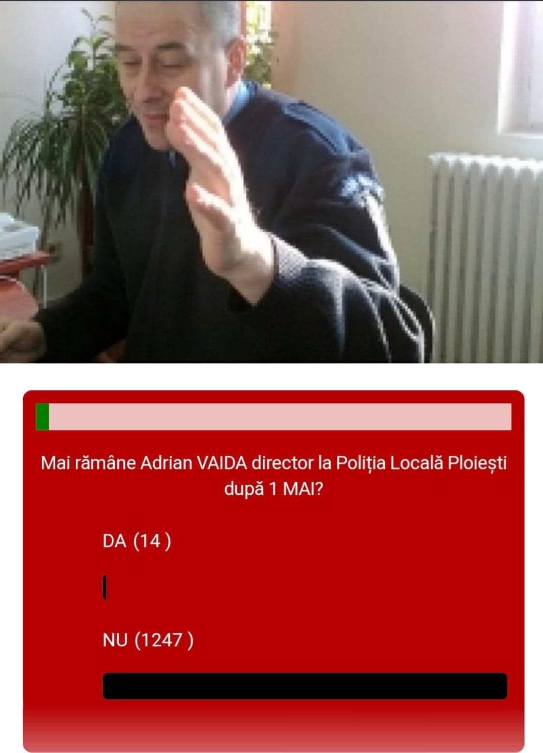 La intrebarea daca acest personaj va mai ramane la conducerea Politiei Locale Ploiesti dupa data de 1 Mai, 14 cititori au raspuns cu DA (un procentaj cam mare in opinia noastra) – iar 1247 de cititori au raspuns cu – NU!