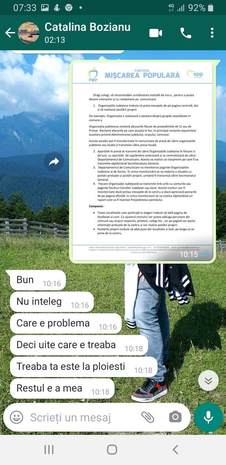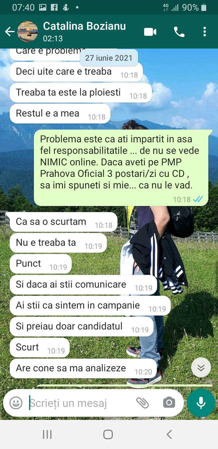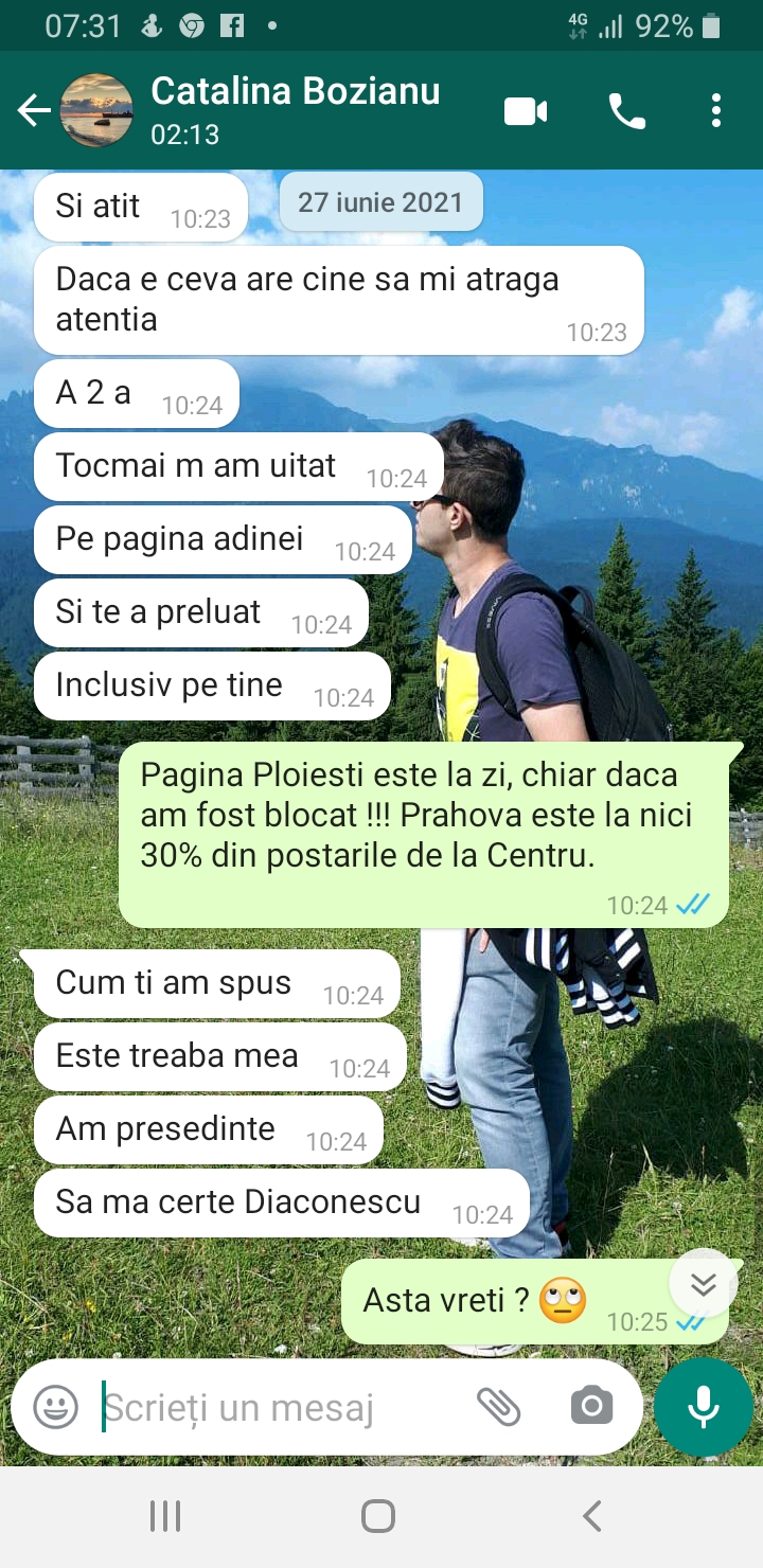 Va prezentam print screen-uri dintr-o convorbire a unui membru PMP si Presedinta PMP, Catalina Bozianu din alegerile locale partiale prin care i se atragea atentia ca Presedintele Cristian Diaconescu nu este promovat pe pagina oficiala a PMP Prahova, promovarea fiind sub 30% fata de centru.