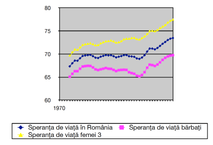 În urma cu ceva timp am făcut un studiu, analizând cum a crescut speranța de viață în România. Grafic, concluziile arată așa pe intervalul analizat (1970-2010)