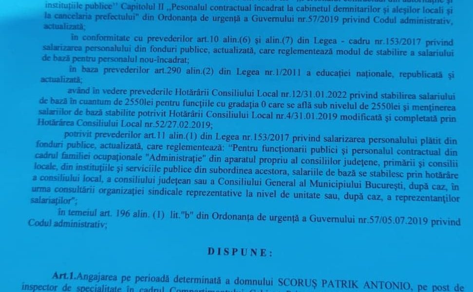 Pe modelul Valeriu Răchită, consilierul personal al edilului, Patrik Scoruş ocupa una dintre cele 3 functii de metodist, o functie care NU se regaseste in reglementarile legale aprobate prin HCL!
