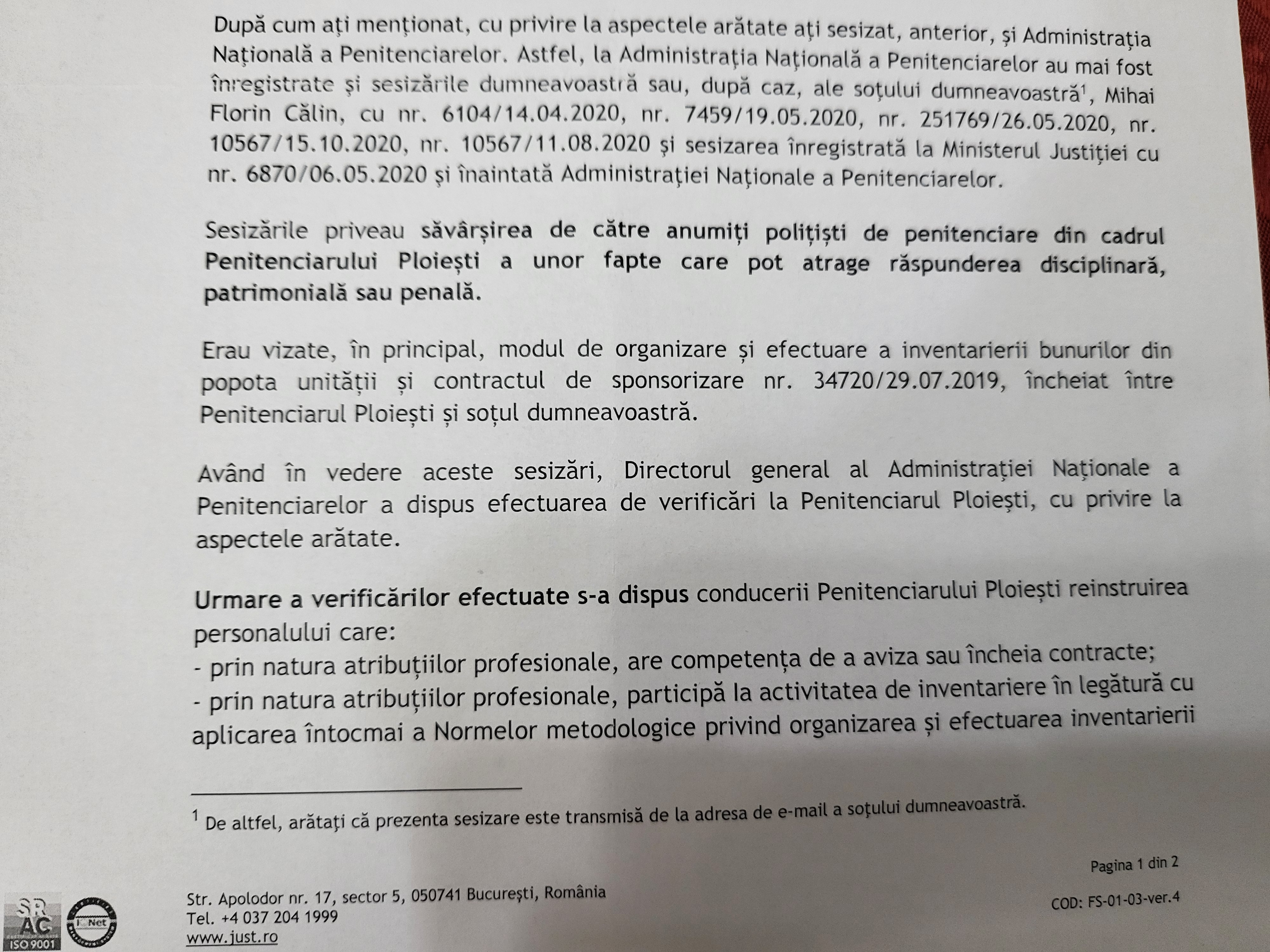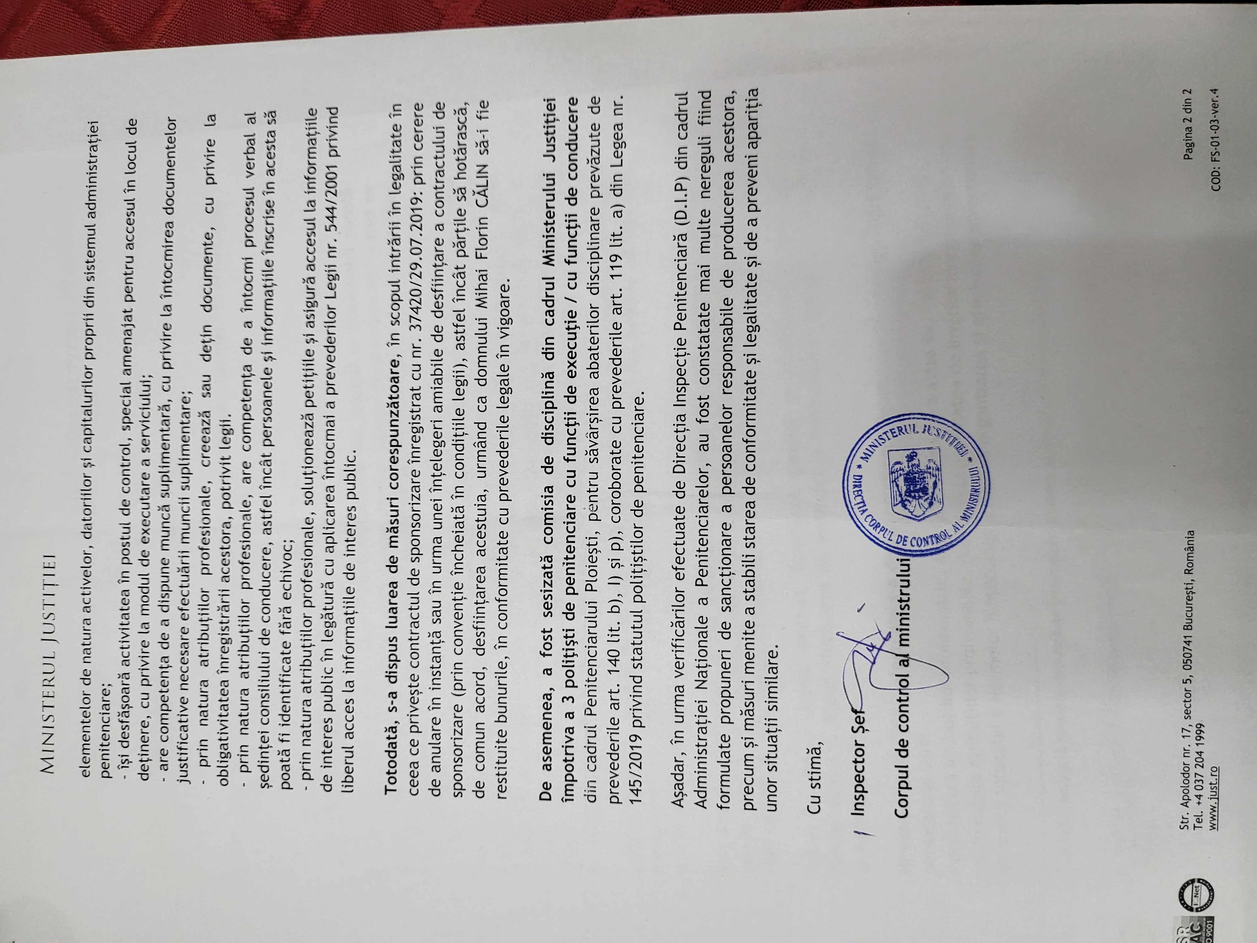Mai precizam ca, drept justă pedeapsă pentru merite deosebite , domnul director Brânzan Celestin a fost recompensat de domnul director general ANP Ungureanu Tiberiu cu spor de 50%, pe termen de 6 luni, anul 2020 deși în nota nr.6104 din 05.06.2020, domnul Ungureanu Tiberiu (actualmente consilier al Ministrului Justitiei) aprobă sesizarea comisiei de disciplină din cadrul ANP pentru săvârșirea abaterilor disciplinare prev.de .art.140 lit.b,l,p,coroborate cu prevedetrile art.119,lit.a din Legea nr.145 din 2019 privind statutul polițiștilor de penitenciare, pentru deficiențele identificate în prezenta notă de constatare în sarcina acestuia. Ulterior, Branzan Celestin s-a pensionat, cu pensia „umflata”, pe bani publici, inlocuitor la comanda fiind promovat, tot pentru „merite deosebite”, comisarul sef Valentin Matei care fusese propus spre cercetare la comisia de disciplina.