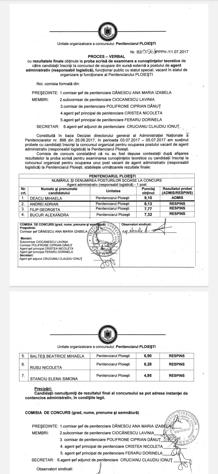 În data de 11.07.2017 conform PV nr B2/305  ,,Bobiță”a participat , ca membru, în comisia de examinare probă scrisă pentru ocuparea postului de agent administrativ, alături bineînțeles de Regină ca președinte al comisiei și nelipsita mâna dreaptă a Reginei, Cristea Nicoleta, unde nașa surorii lui Zeus din Olimp, Deacu Mihaela, a susținut examenul și promovat cu nota 9,10, fiind singura Admisă din cei 7 concurenți, așa cum îi stă bine unei nașe.
