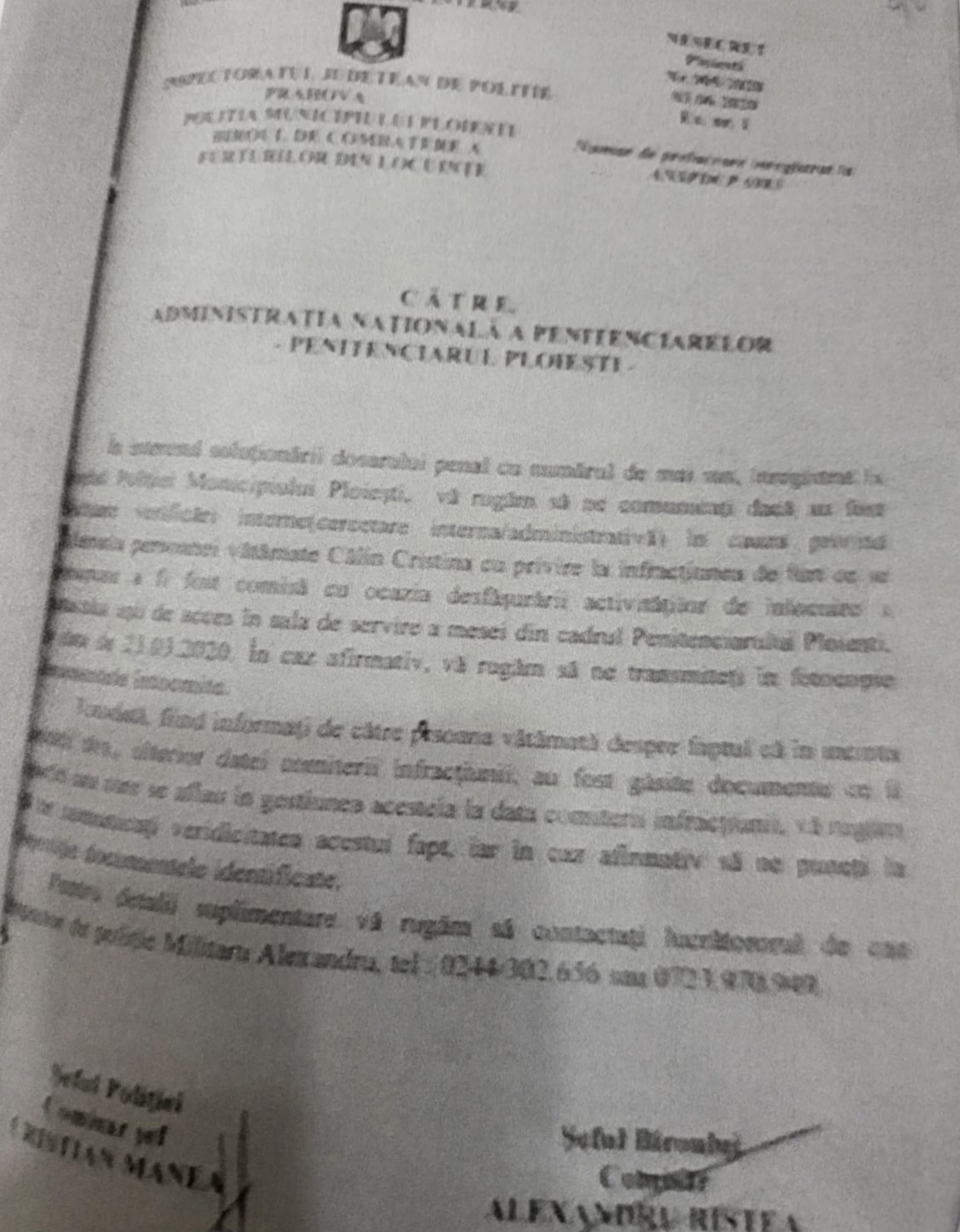 ,,Conform discuției dintre conducerea Penitenciarului Ploiești și reprezentanții instituției dvs, v-am transmis prin adresa B2-29065/PPPH/03.07.2020 , doar o parte din documentele personale ale persoanei vătămate Cristina Călin.,,