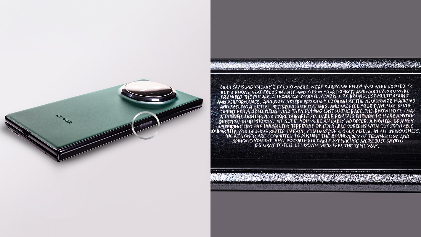 Un mesaj de scuze, compus din 166 de cuvinte, a fost gravat manual pe balamaua delicată a HONOR Magic V3