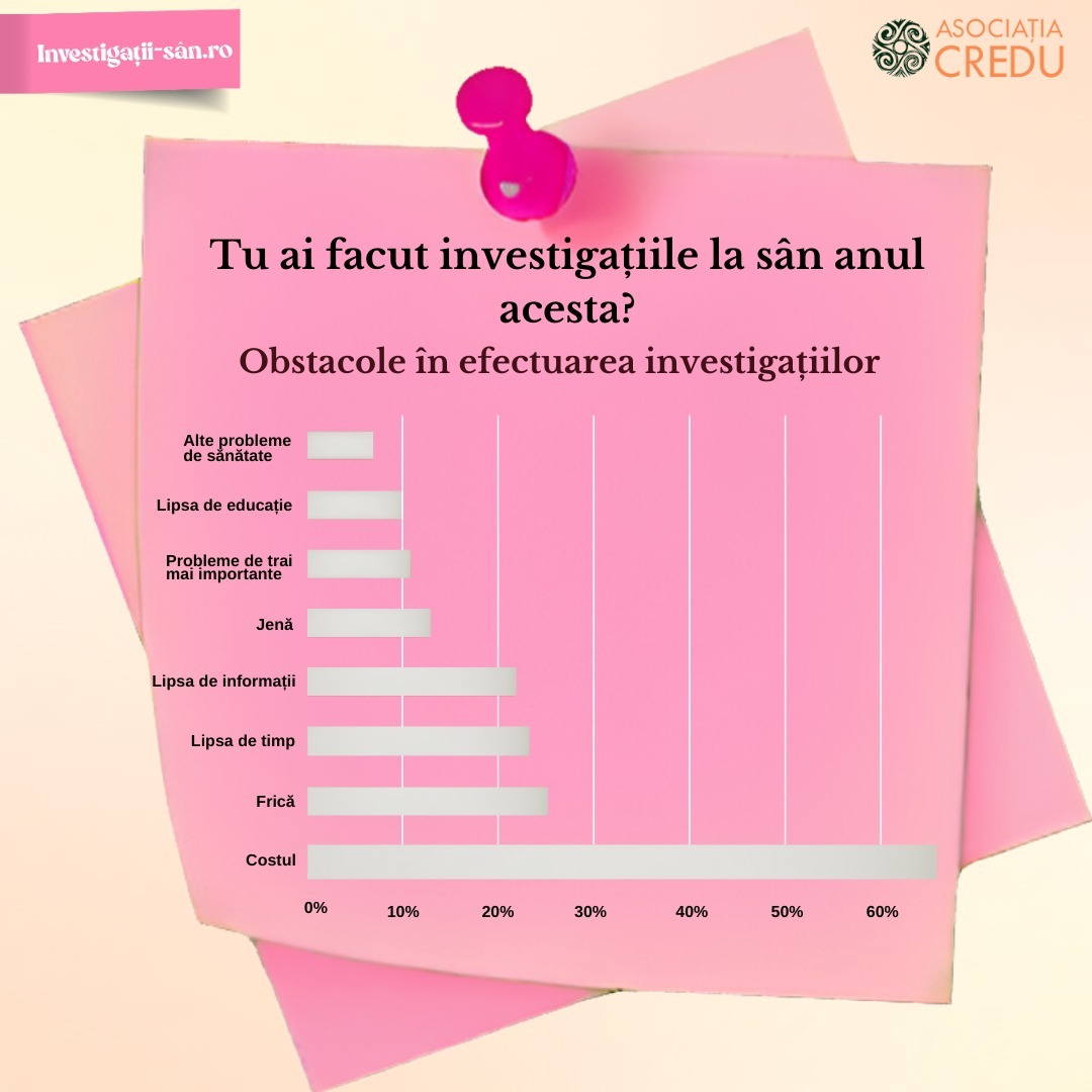 • Frica: 25.2%dintre participanți au declarat că frica este un factor care îi descurajează să efectueze investigații la sân.